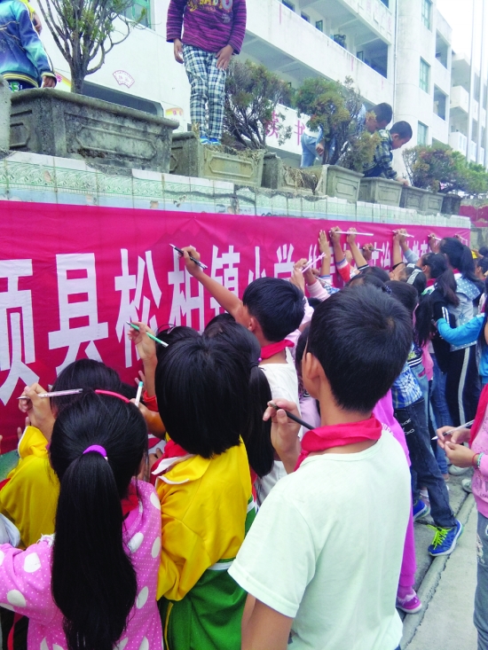 近日,永顺县松柏小学开展“学法守法,防止校园暴力”学生签名活动。全校1300余名学生积极签名,争做知法、守法的好学生。 罗远程 摄
