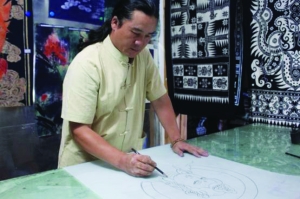 溪 源 初 至 2003年冬一个朦胧的大雾早晨,静谧的凤凰古城躺在这棉花糖似的浓雾中。在十字街的青石板路上,一个年轻人饥肠辘辘,来回踱步,正在着急等待什么似的。此刻,他的兜里全部的资金是350元。当一个店面的木板门被一一揭开,他便立刻走上前去,和开门的阿婆聊了起来。结果,他用内心对蜡染执着坚定的热忱感动了善良的阿婆,一个专事蜡染的店面入驻凤凰古城。 这个年轻人的名字叫王曜,布依族,贵州省安顺县杨武台人。这是王曜第二次来凤凰,是在去张家界推销蜡染后回贵州的途程中临时起意,想再一睹古城的红色城墙,挑一手沱江水洗去创业身心的疲惫,只是没想到踏进来的铅重步伐变得轻盈矫健,从此,却不愿再离开这一片山水。 选择凤凰作为发展之地,是他的眼光和能力所在,即使孤注一掷,他和蜡染都翻开了前所未有的一页。 起 航 从“蜡染之乡”走出来的他,带着一身的好技艺开始“染指”凤凰古城的一砖一水,一山一人,一情一景,美丽的苗族姑娘、苗寨、吊脚楼、跳岩、银饰、苗服等当地元素越来越多地融入到王曜的蜡染世界。在一蓝一白的色调中,古城又新添了另一层韵味。 2006年,王曜在古城回龙阁建立了新的蜡魂店面,即如今的蜡魂艺术馆。馆前屹立一个大大的蚩尤铜像,成为馆址所在地的标志,同时也像守护神一样为蜡染保驾护航。 2008年王曜亲手绘制了古城的旅游地图和宣传画。他给地图封面的诠释是:“任春秋时光在如雾、水、风般的发髻中流淌,千年古城美景依旧,美丽的阿妹在沱江边痴情等你的来到。”他笔下的苗家阿妹多了一份佛家空灵之感,宁静、慈祥的神情给人一种世外仙姝的向往。这或许是他擅长画佛的缘由,亦或许是他理解中阿妹等待远方情人的神情。当然,这只是笔者的猜想和个人领悟。一千个读者就有一千个哈姆雷特,每一个来凤凰古城游玩的游客手执地图首页,详看那幅封面画时,或许都不会留意那是出自王曜之手,但肯定会对画中美丽的阿妹深深吸引。 收 获 随着蜡魂的名气越来越大,专家、学者、高校师生、媒体等纷纷慕名而来,这其中更是成就了一段好姻缘。2005年吉首大学女学生袁熔为她的毕业论文课题寻找资料,前来咨询,同是蜡染爱好者,又都有绘画功底,可谓是志同道合。2008年,蜡染为媒,古城为证,王曜与袁熔喜结连理。二人结婚后,便开始着手蜡染新产品的研发。为了拓宽蜡染市场,二人决定不仅仅局限于家居装饰品的制作,而是把精心设计好富含苗族文化内涵的图案制成蜡染布匹,再制成旗袍、长裙、短裙等服装样式,把蜡染技艺推向更广阔的平台。 2016年3月4日,春光明媚,在湘西自治州吉首市人民广场举办的“美丽湘西·我的家园”创建民族团结进步示范州—————民族文化进机关、“最炫民族风”湘西州首届民族民间服饰大赛上,王曜精心染制的花样各异的蓝黑主色系旗袍给了评委眼前一亮,啧啧称赞,并最终获得了旗袍大赛二等奖。传统蜡染技艺走上时尚舞台,这无疑是对传统技艺的一次成功挑战和创新。 展 翅 当大多数民间非物质文化遗产面临传承危机,不知何去何从时,王曜没有把蜡染交与市场,任它随之飘摇,也没有交与政府兜底保护。中国最古老的传统三大印染技艺之一———蜡染,在他的不断思索和创新中,找到了新的价值和发展方向。 现如今,身为非物质文化遗产代表性传承人的他,身份很多,既是中国民族蜡染艺术大师,也是湖南省民间美术研究会副主席,还是湘西州政协委员等等。但在他的心里,最重要的还是非遗传承人的身份。不管是领导调研、还是高校师生交流学艺、抑或普通的游客到访,他都耐心讲解,不厌其烦,认真配合。作为吉首市民族中学的蜡染指导老师,他为学生讲解蜡染文化、蜡染制作技巧时,心中燃起的蜡染传承有望的小火苗,也让他倍感温暖。 王曜凭借自身扎实深厚的蜡染制作实力和不断追求进步创新的精神,以及他用生命热爱蜡染、热爱绘画的劲头迎来了自己人生的春天,蜡染的黄金时代。各种荣誉也随之而来,他的作品也在县委宣传部门和文化主管部门的推荐下,先后参加了各级各类旅游商品展或非遗展,获得了诸多大大小小的奖项。其中,2010—2012年,在中国湖南旅游商品博览会旅游商品设计大赛中分别荣获“银奖”、“铜奖”;2012年12月,蜡染作品《飞天》入选2012湖南工艺美术职业学院第二届学院奖;2015年10月,王曜凭借作品《千手观音》,在第二届中国民族工艺美术珍品展上,荣获中国民族工艺美术“神工·百花奖”金奖。由于诚信经营和对凤凰旅游的特殊贡献,先后荣获“凤凰县光彩事业推动工作先进个人”、“凤凰旅游十年‘百名突出贡献者’”、“凤凰县文明经营之星”、“文明诚信经营户”、“十佳道德品质模范”、“光彩事业工作先进个人”等殊荣。 坚 守 曾为学艺睡过山洞、躺过棺材板,也曾因年轻气盛离开国有企业蜡染总厂,自创作坊,闯荡商海,历经大起大落。现如今,沉浮之中,各般味道都化作了一笑。“为了蜡染,什么都是值得的”,王曜说,“因为那是我的生命。” 苏轼在《定风波》中有言:“此心安处是吾乡。” 王曜的心安在了凤凰古城,这也成为他的第二故乡。在这里,古城的美景和苗族的人文情怀成就了他的蜡染梦,他也让古城熠熠生辉。但蜡染传承保 护和创新发展的路还有很长,相信只要本着一颗坚定执着的心,将终有