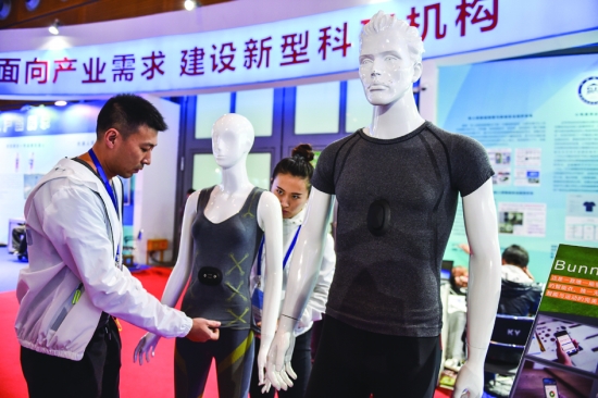 ▲ 这是11月16日拍摄的阿木新科技公司推出的智能跑步衣。这款衣服将柔性传感技术与衣物相结合,在运动中实时监测心电图,并显示在app上。