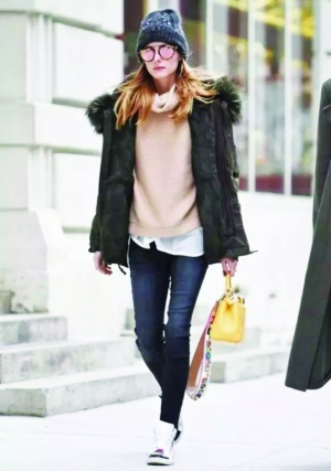 法则一:下半身一定要紧 紧身的牛仔裤搭配短款羽绒服,不仅显瘦还能拉长比例。