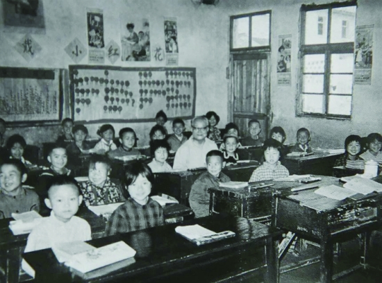 沈从文1982年回乡在母校教室与孩子们合影(资料图片)