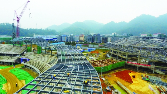 目前整个体育中心主体钢结构工程已完成90%左右,建设者在寒风中给钢结构件刷漆,整个体育场能容纳23000名观众。
