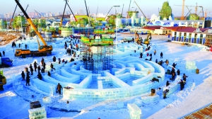 占地面积80万平方米的哈尔滨冰雪大世界是一年一度的“哈尔滨冰雪节”主景观之一。目前园区内有近万名工匠昼夜奋战,加速建设,很多景观已经初具雏形。园区今年预计总用冰量18万立方米,总用雪量15万立方米,12月21日试开园。