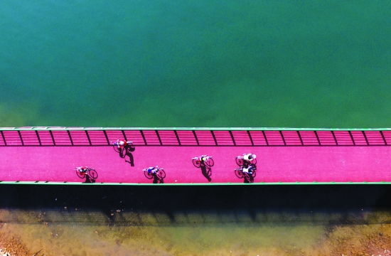 市民在广西柳州市环江滨水大道的沿河休闲自行车道上骑行(2月28日摄)。 新华社发(黎寒池 摄)