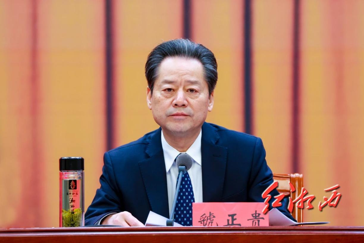 虢正贵强调,要以久久为功的定力纵深推进全面从严治党,为现代化新湘西建设取得新的更大进展提供坚实保障。要着力强化政治建设,始终把党的政治纪律和政治规矩挺在前面,推进政治监督具体化、精准化、常态化,坚持党中央重大决策部署到哪里、政治监督就跟进到哪里,深入开展习近平总书记重要指示批示落实情况“回头看”,确保党中央决策部署在湘西令行禁止、不打折扣。要着力打好反腐败斗争攻坚战持久战,始终保持惩治腐败高压态势,坚持行贿受贿一起查,深化改革阻断腐败滋生蔓延,及时堵塞制度漏洞。要着力纠治“四风”顽疾,坚决惩治享乐主义、奢靡之风,坚决整治形式主义、官僚主义,持续推进为基层松绑减负,深化“两带头五整治”专项行动,大力开展时代新风宣传教育,大兴务实之风、弘扬清廉之风、养成俭朴之风。要着力深化党的纪律建设,深入开展党性党风党纪教育,准确规范运用“四种形态”,精准落实“三个区分开来”,加强对“一把手”和领导班子的监督,加强新时代廉洁文化建设,高度重视家庭家教家风建设。要着力护航经济高质量发展,充分发挥纪检监察机关监督保障执行、促进完善发展作用,在提升营商环境软实力、提振干事创业精气神、提升政策落实惠民度上聚焦发力,不断巩固和增强经济回升向好态势。要着力压紧压实管党治党责任,始终坚持严的基调、严的措施、严的氛围,真管真严、敢管敢严、长管长严。