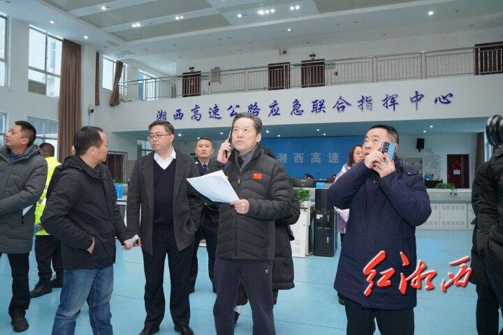 虢正贵在湘西高速公路应急联合指挥中心调度全州抗击雨雪冰冻各项工作,关切之情溢于言表。