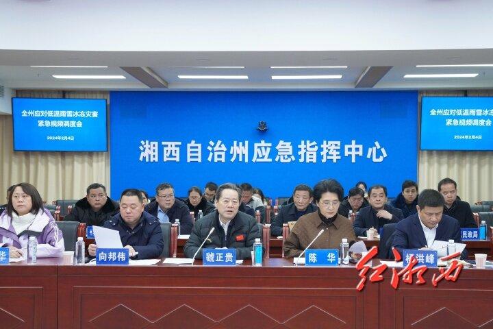 在州应急指挥中心召开的全州应对低温雨雪冰冻灾害紧急视频调度会上,虢正贵认真听取8县市和湘西高新区工作情况汇报。他说,通过全州上下全力以赴的共同努力,度过了一个不眠之夜,全州整体安全稳定,社会反映良好,但是不能有任何松懈,要抢抓4日白天有利时间段,进一步明确工作重点,不断调整优化工作方案,确保有力有序应对低温雨雪冰冻灾害。虢正贵强调,此轮低温雨雪冰冻天气是对基层治理体系和治理能力的现实考验,各行各业要以高度负责的态度和实战的标准,牢牢守住安全底线。要有强烈的民本意识,保障好全州广大群众尤其是受灾群众的生活,一户不落开展敲门行动,把情况搞清楚、把灾情统上来,把党和政府的关怀温暖送上门。对滞留在湘西境内的人员和车辆,保暖、饮水、基本生活和救援要有保障,让他们感受到湘西温度。