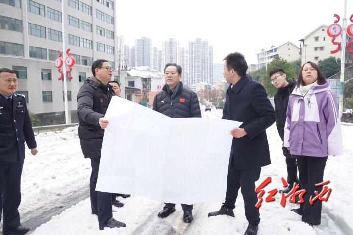 在吉首市财政局至吉首西高速公路收费站路段,青年志愿者、附近单位干部职工冒着严寒,手拿铁锹、扫帚等清雪工具,齐心协力清理路上的积雪,几台扫雪车也不停作业,虢正贵边走边查看现场扫雪情况,嘱咐大家要注意安全,尽快畅通高速进出口道路,减少车辆滞留。