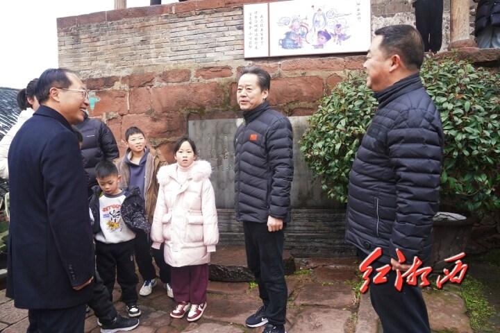 凤凰古城内处处张灯结彩,鼓声、唢呐声、群众的欢呼声沿着沱江飘荡,整个古城笼罩在节日的喜庆氛围里。虢正贵来到文星街、北门城楼、从文广场、凤凰样子文化村、温德姆酒店等地,了解旅游市场、旅游演艺、旅游接待服务等情况,督导安全生产工作。调研过程中,他时不时停下脚步,汇入人群中,认真观看群众汇演,感受民族文化艺术;走进沿街商铺,了解生产经营情况,与过往游客亲切交谈,给商户、游客拜年,祝福大家万事如意、龙年龘龘。