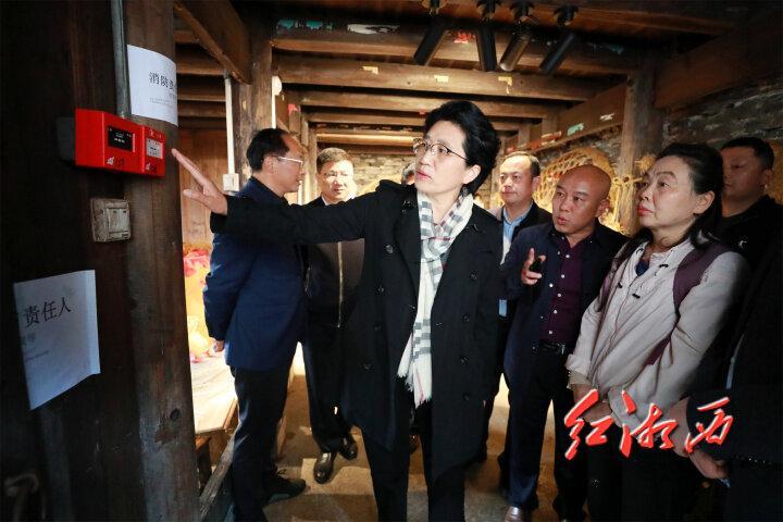 凤凰县廖家桥镇拉毫古村是古时苗疆边墙线上的重要军事要寨,先后获评“全国重点文物保护单位”“国家森林乡村”、第一批中国传统村落。陈华沿着古村落青石板路拾级而上,与村寨负责人、商户、居民交谈,检查消防设施、消防应急方案和应急处置等工作。她说,传统村落是一本历史书,要保护利用好,引导村民增强保护意识,特别是加强消防知识培训,维护和利用好现有的消防设施,突出应急演练效果,培养一批懂消防、会消防的微型消防员。