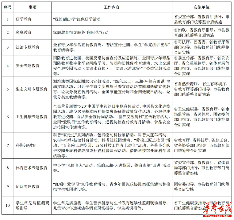 通知要求,各市州要迅速参照省级做法,认真厘清各类社会事务与教育系统职责的边界,进一步排查清理本级并督促县市区排查清理涉及中小学校和教师的各类督查检查评比考核和进校园活动事项,严格标准,严控总量,分级建立白名单并向社会公布。从2025年起,各市州(含所辖县市区)白名单须于每年春季学期开学前报送省教育厅,报送要求另行通知。