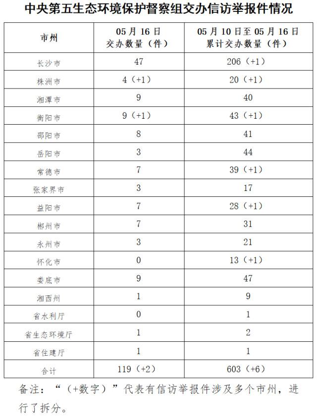 截至目前,中央第五生态环境保护督察组共向我省转办了7批603件信访件,重点件47件,占比约7.8%。交办信访件累计数量前三位的市州是长沙市、娄底市和岳阳市,分别接收到转办信访件206件、47件和44件。