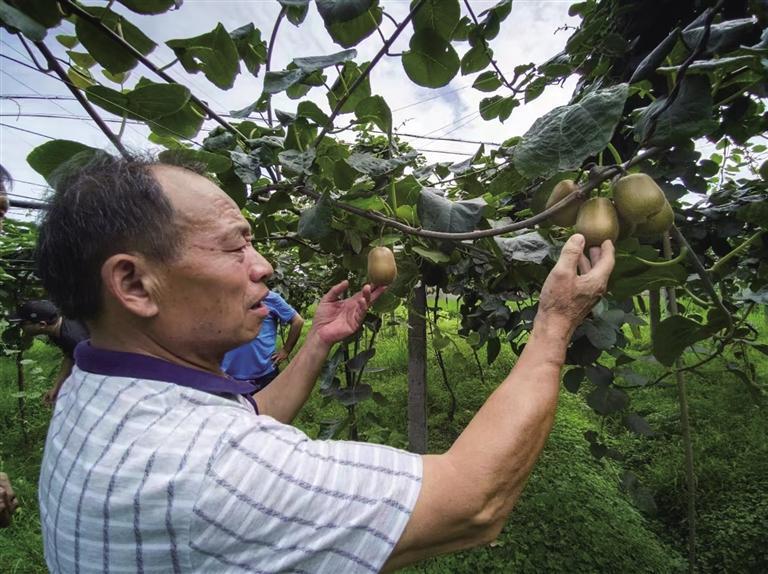 石绍生在红心猕猴桃基地察看果实品质。 图片由凤凰县老科协提供