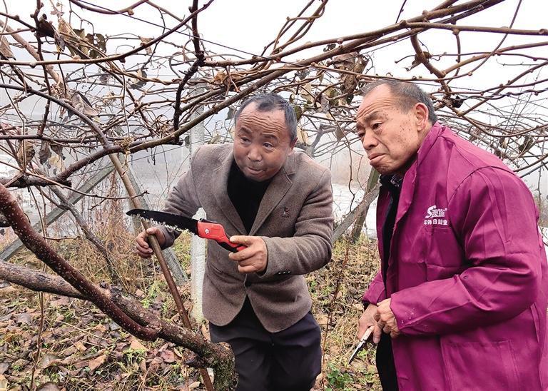 石绍生(右)指导猕猴桃育苗大户王兵进行冬季培管。