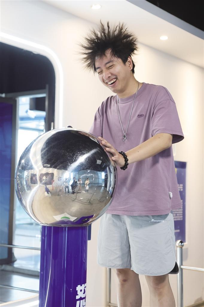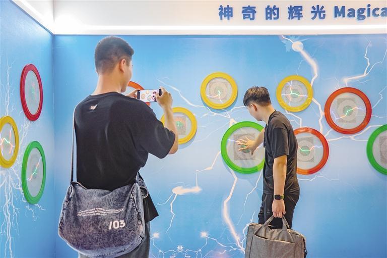 游客在科普体验馆里玩得不亦乐乎,同伴忙着记录下有趣的瞬间。