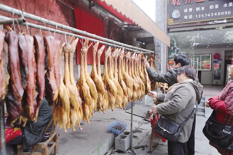 除了酸辣,乾州古城的板鸭也是吉首美食一绝。据说乾州板鸭的制作技术已有300多年,与吉首河溪镇贡醋的历史差不多。“鸭要肥,喂稻谷,炒盐腌,焐得足,大料实,风得干,皮金黄,肉红爽,骨头酥”,这是对制作乾州板鸭原材料的特别要求,唯此才能制作出油光发亮、肉质细嫩、馥郁扑鼻、美味绝佳的正宗乾州板鸭。当然,有了这些原材料还不够,还得配上二水绕洲、三陆横陈、状如乾卦、地理位置得天独厚的乾州古城,没有了这块风水宝地,自然也就无处可产如此美味的乾州板鸭了。