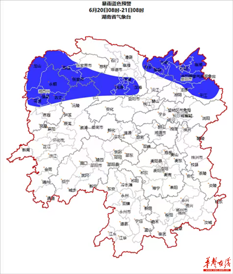 华声在线6月20日讯(记者 赵瞳铱 通讯员 林城)湖南省气象台6月20日6时发布暴雨蓝色预警:预计20日08时至21日8时,岳阳、常德南部、张家界、益阳东北部、湘西州将出现暴雨,并伴有短时强降水、雷雨大风等强对流天气,请加强防范。
