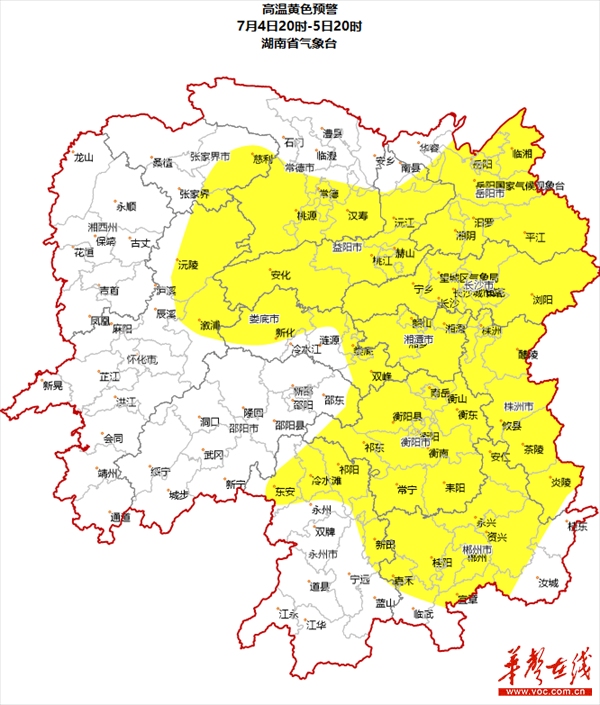 华声在线7月14日讯(记者 卢小伟 通讯员 林城)大雨过后防高温!湖南省气象台7月4日16时发布高温黄色预警:预计4日20时至5日20时,长沙、株洲、湘潭、衡阳、岳阳、常德南部、张家界东部、益阳、郴州、永州北部、怀化北部、娄底将达到35℃以上高温,局部地区将达37℃以上,请做好防范。
