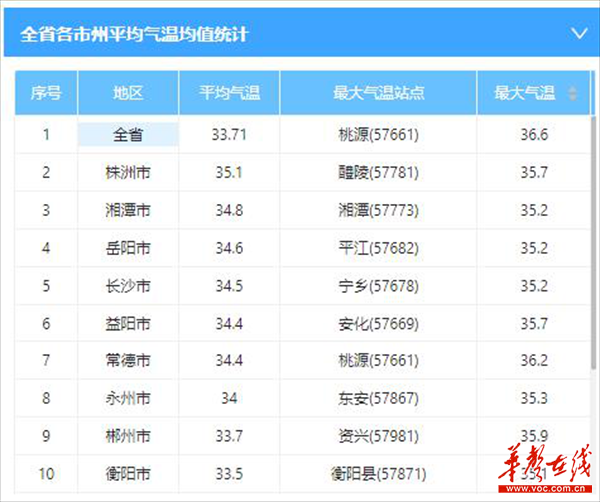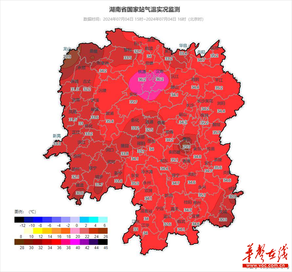 雨过天晴,气温快速升高。湖南省国家站气温实况监测显示,7月4日15时至16时,湖南大部气温在34~36℃之间(湘西气温略偏低,大部在31~33℃之间),其中常德市汉寿县、桃源县4日15时至16时气温超过36℃,达36.2℃。