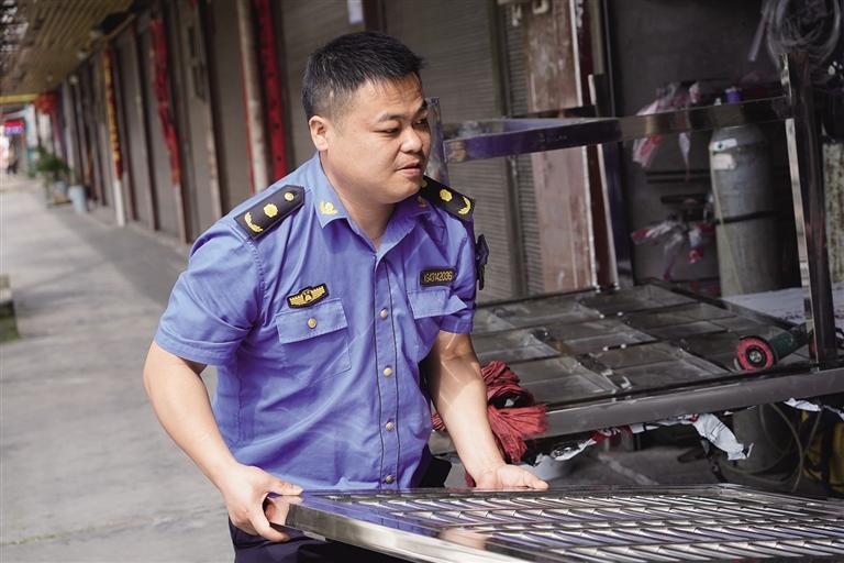 石军在清理路边商户随意摆放的物品。 团结报全媒体记者 彭博 摄