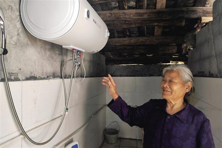 彭兴莲指着家中的热水器高兴地说着家改带来的方便。