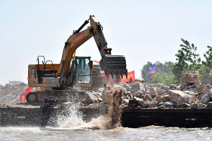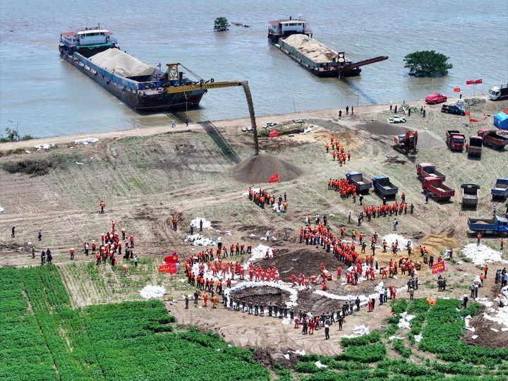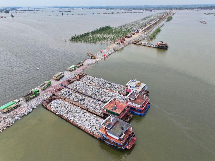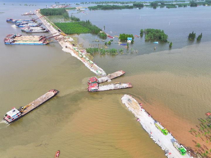 11日,湖南省华容县团洲垸,已经合龙的洞庭湖大堤堵口正在加固。