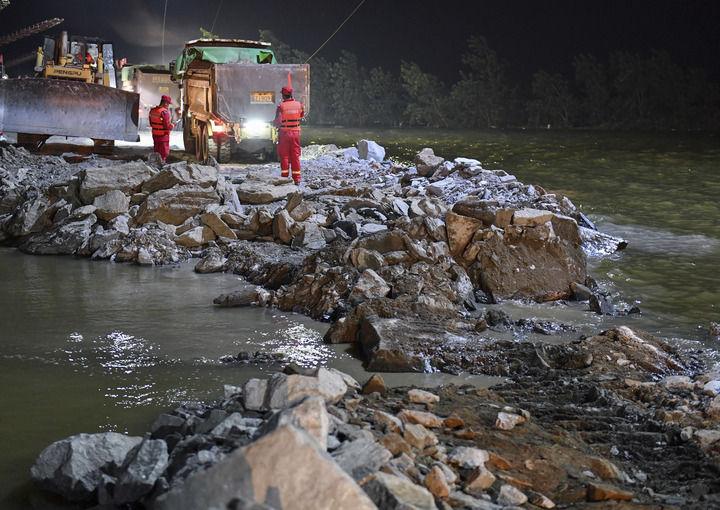 6日,中国安能集团、武警、消防等单位480余人抵达堵口一线,挖掘机、推土机等工程装备从堤坝决口两岸推进,大型驳船在决口中心源源不断抛投石料,“人歇机不歇”。