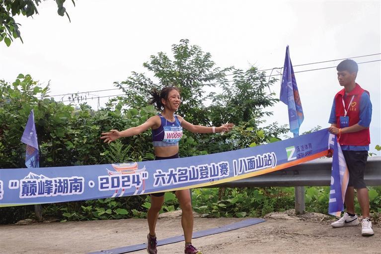 八面山徒步登山赛女子组冠军冲线瞬间。