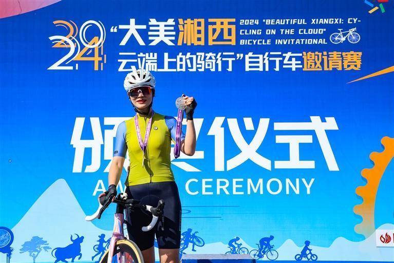 去年才开始练习骑行,马琴觉得自己只能算一名“初学者”。第一次来湘西参赛,里耶古城至惹巴拉沿途的风景让她沉醉。8月11日的女子公路组自行车邀请赛中,她收获一枚铜牌。“赛道很美,赛场上认识了许多可敬可爱的选手,他们更美。”