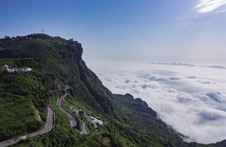 选手们在八面山的山路上骑行,身旁就是茫茫云海,果然不负“云端上的骑行”之名。