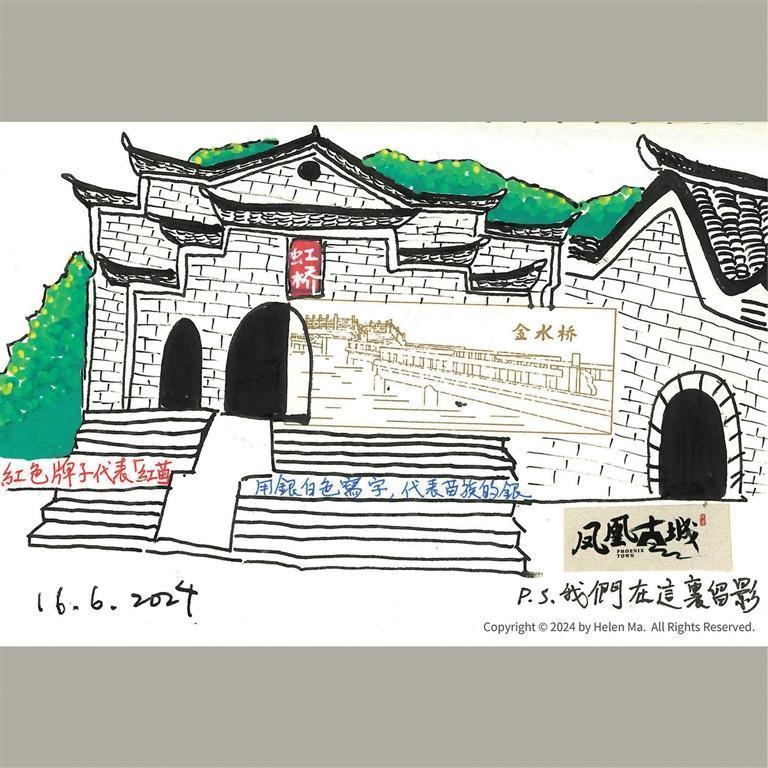 从手账中可看到,短短几天的行程中,马凯君深深地感受到了凤凰这座城市的文化魅力。凤凰的地域文化特色、建筑设计都给她留下了深刻的印象。她在手账中写到,“ 如果荷兰的cand houses(运河屋)让我仿佛置身于童话世界之中,那么凤凰古城中沱江河两旁的新旧屋子,让我置身于诗画之中。”凤凰的轮廓在马凯君心中变得立体,每页的画配文字,满满都是凤凰味道。