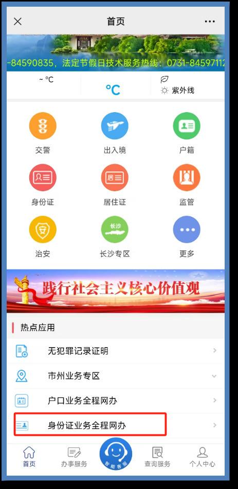 湖南户籍居民可微信关注“湖南公安服务平台”公众号,点击“微警务”,进入平台首页,注册并实人认证登录后(姓名变更、住址变更、民族变更更正申请人用变更前身份登录),在热点应用栏中选择“身份证业务全程网办”进行办理。
