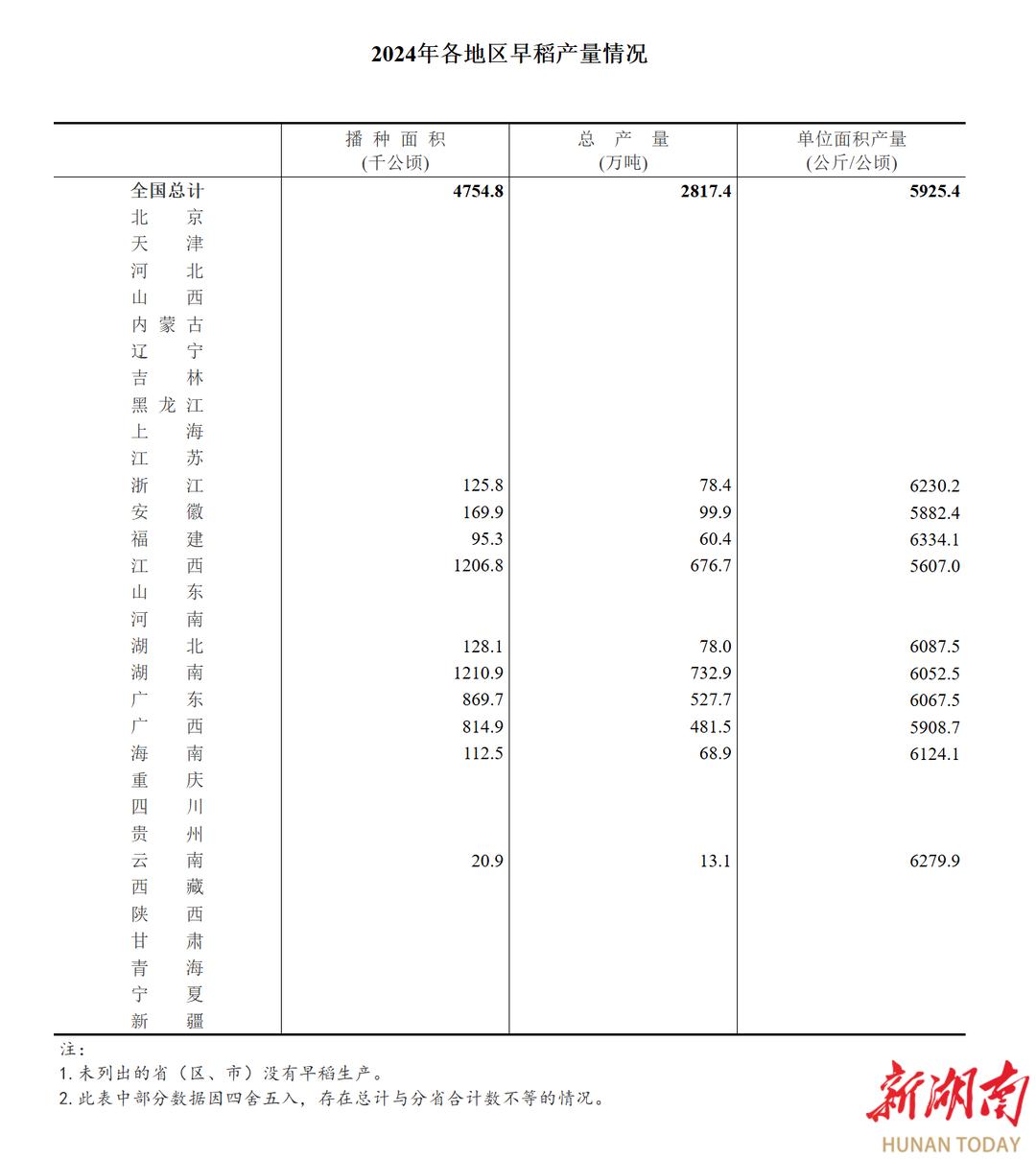 华声在线8月26日讯(全媒体记者 胡盼盼 通讯员 彭楚璨 陈诚)8月23日,国家统计局公布2024年全国早稻数据,全国早稻播种面积7132.2万亩、总产量563.5亿斤。其中,湖南早稻播种面积1816.4万亩、总产量146.6亿斤,面积、总产量均居全国首位。