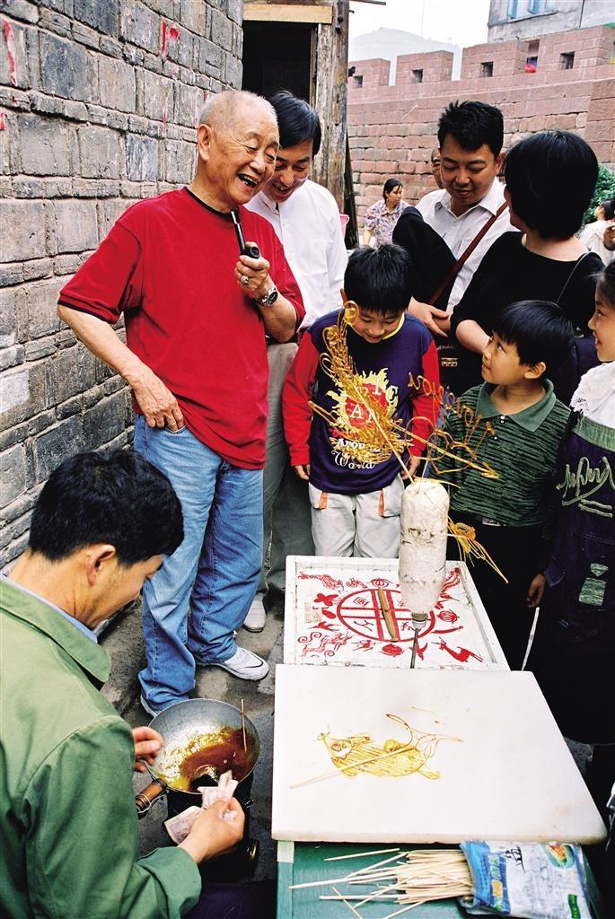 糖人的制作工艺主要包括吹糖人、画糖人和塑糖人三种,这一手工艺遍布祖国大江南北,深受小朋友们的喜爱,也是许多成年人儿时的美好回忆。这是1997年初秋,凤凰东城门旁的这个糖人手艺小摊儿,将先生的思绪拉回到久远的孩童时代,让他的笑容有了一种穿越感。
