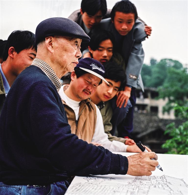 作为一代艺术宗师,黄永玉在绘画、文学、泥塑、木刻等方面都有自己独树一帜的迷人特质,为世人称道,对家乡影响巨大。能近距离围观他的创作,是凤凰后生难得的学习机会,先生传道授业,乐此不疲。这是1997年他在凤凰古城虹桥上写生时现场教学场景。