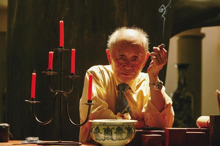 黄永玉曾说: “一个战士,不是战死沙场便是回到故乡。”先生如果能算做战士的话,应该说,他既在战场上建立了不朽的功勋,也如愿以偿地回到了自己的故乡,两全其美,美美与共!这是2004年4月,先生在凤凰古城自建的玉氏山房家里抽着雪茄,怡然自得地在红烛台旁留影存念。