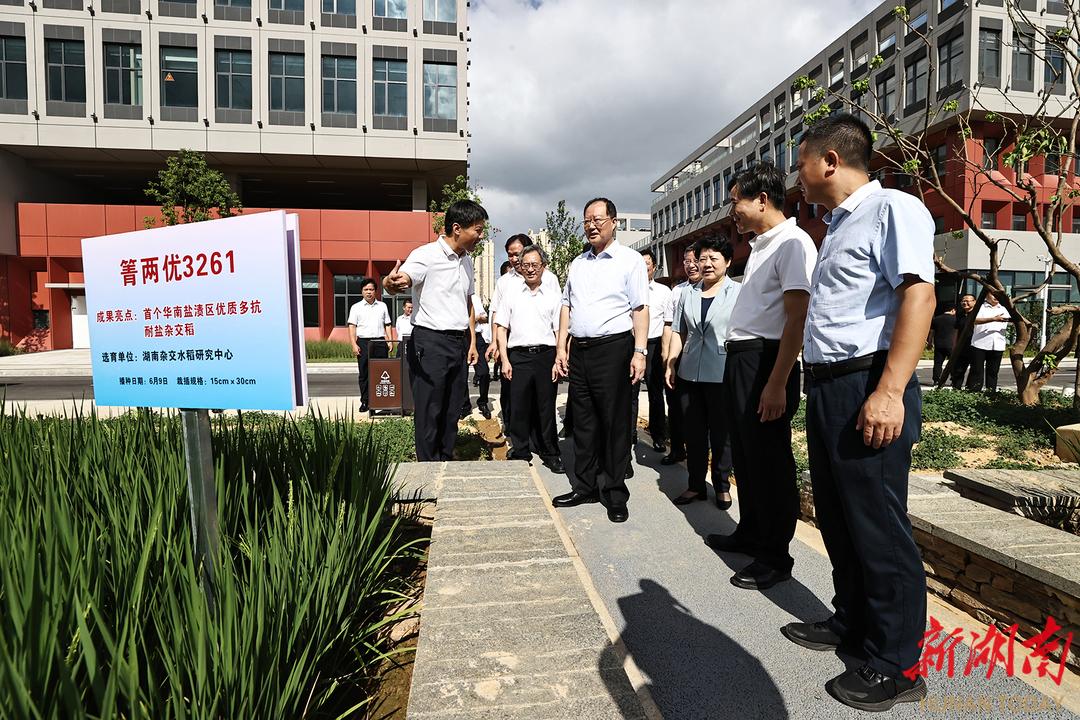 岳麓山实验室以“建设国内顶尖、世界一流的种业实验室”为目标,致力于种质资源保护利用、基础理论与前沿技术研究、关键核心技术攻关、重大战略性新品种培育等,是我省“4+4科创工程”的核心组成部分。实验室主要布局集聚区、隆平片区、林大林科院片区、岳麓山大科城四大片区,构建“4个功能研究部+8个公共创新平台+15个品种创制中心”功能平台体系,预计今年10月将迎来首批科研团队入驻。岳麓山实验室集聚区占地589.85亩、总建筑面积41.76万平方米,17栋主体建筑已进入收尾阶段,未来这里将成为重大战略种源创新区、生物遗传基础和育种共性技术研究创新区、高水平种业创新人才集聚区。毛伟明一行实地察看了油菜品种创制中心、水稻品种创制中心、杂交水稻全国重点实验室和水稻试验田等,详细了解园区布局、实验室配置、功能配套等。他强调,要锚定国内顶尖、世界一流,打造以种业为重点的现代农业实验室,搭建国际化、标准化、通用化、智能化功能平台,加快配套设施建设和人才团队引进,让实验室尽快用起来、成果“长”出来。