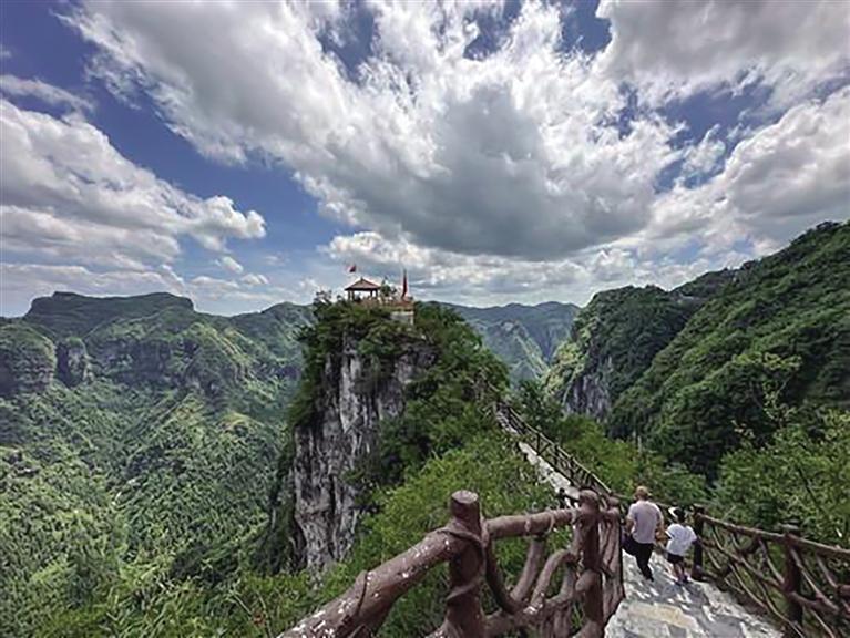 暑假期间,花垣县双龙镇金龙苗寨,三面绝壁的天然观景台吸引各地游客特别是户外爱好者前来“打卡”。 团结报全媒体记者 施雨润苗 摄