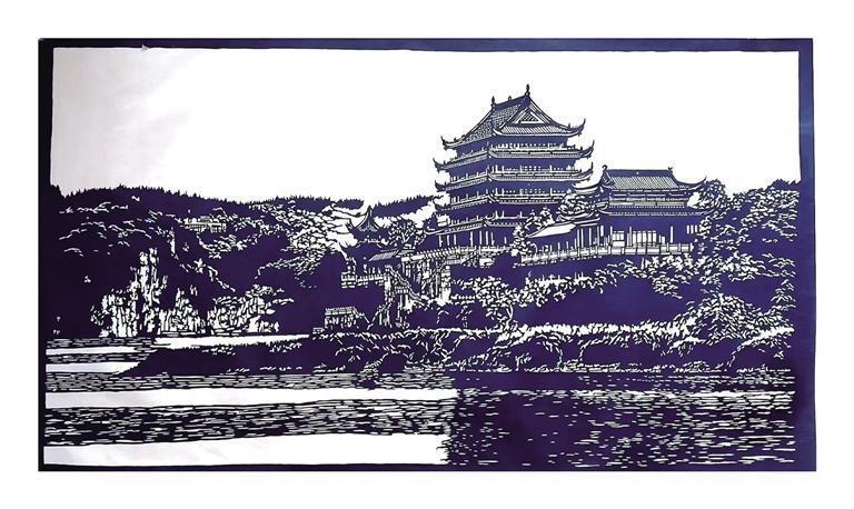 “创作涉江楼我花费了两个月时间。”在王志军的心里,故乡的山水最为动人。他从不同的方向观察涉江楼,最后选择了从侧面体现沅江之上的涉江楼和十里画壁。他一遍一遍地画,一遍一遍地调整设计,然后再进行凿刻。他运用长短线条和波点结合体现沅江的波光粼粼;运用留白的手法和黑白关系体现十里画壁的鬼斧神工;运用阴刻和阳刻体现涉江楼的巍峨,当最后一刀凿刻完,时间似乎静止不动了,他的眼里只有那清波拂面,天地千年如斯。