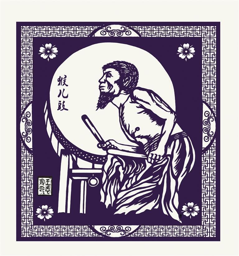 他行走在湘西,把独具风情的猴儿鼓深深地刻印在心间,设计成图样,通过线条粗细变化、长短组合、疏密处理,突出阴刻和阳刻的刀法,并结合点面塑造人物,形象生动地体现出湘西猴儿鼓绘声绘色,活泼美妙的艺术形象。
