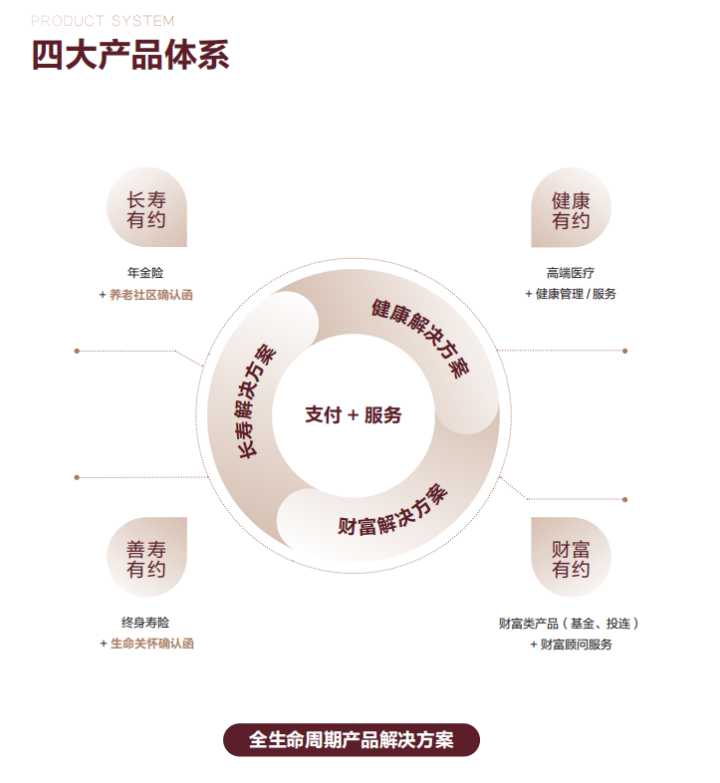 所有的战略和商业模式,必然要由产品和服务承接。为进一步对接多元化、个性化市场需求,泰康“幸福有约”升级为“长寿有约、健康有约、财富有约、善寿有约”四大产品体系,为个人、家庭乃至家族提供全生命周期服务一站式解决方案。其中,以“长寿有约”“健康有约”为核心的“双有约”模式,正持续护航客户的高品质长寿人生。