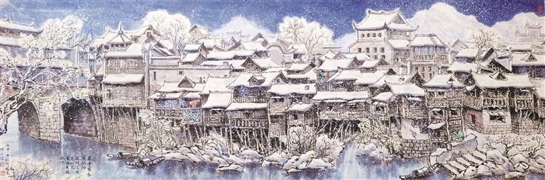 还是一样的地方,一样的吊脚楼。此时,白雪皑皑的沱江两岸,化为一幅《瑞雪飞花兆古城》的画卷。雪纷纷扬扬,落在远山近水,虹桥宝塔上,山水桥塔的轮廓或明或暗,或大或小,环绕吊脚楼群甘当绿叶。白雪覆盖的吊脚楼,白色的屋顶与灰黄的楼柱楼壁形成强烈的色彩反差,给白茫茫的世界点起了一抹招人的妩媚。“飞雪带春风,徘徊乱绕空。君看似花处,偏在凤城中。”从改动的古诗和创作《瑞雪迎春》《正值飞花入户时》《古城瑞雪》等几十幅雪景图,可以看出陈永健对古城雪景分外的偏爱。