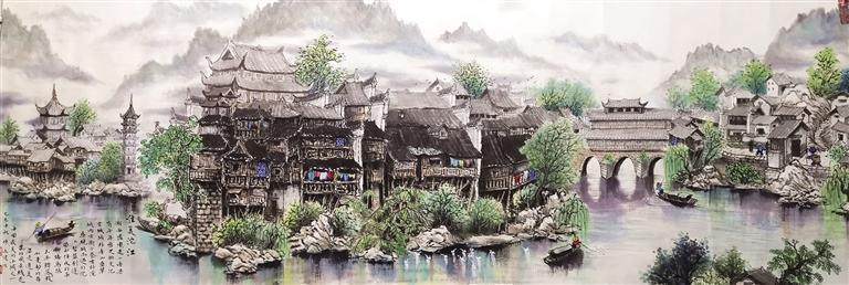 画过山,画过水,最爱画的还是凤凰古城的吊脚楼。陈永健为此说,凤凰是他的家乡,吊脚楼是家乡最美的地方,他当然要把家乡最美的地方画出来,把家乡的美名传出去,让更多的人欣赏,更多的人来游览。赤子之心,全在画中。