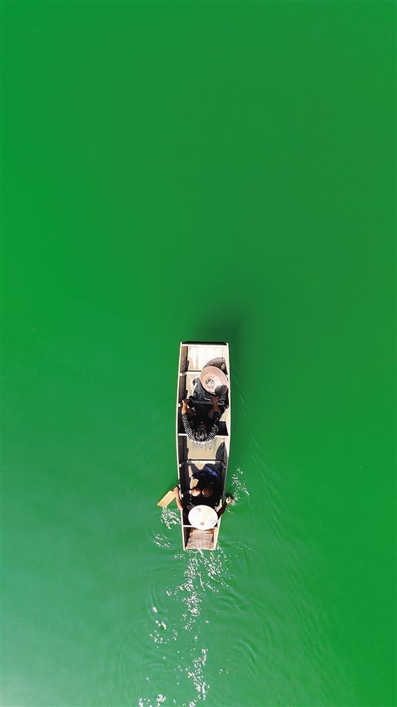 虽已入秋,正午的太阳仍然火辣。泛舟绿绿河上,时有微风拂面,令人甚感凉爽。风过时,两岸树上有枯叶飘落水面,浮在河上,为碧绿的水面平添一分静谧。