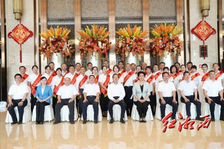 虢正贵、陈华等领导与全州优秀教师代表合影。
