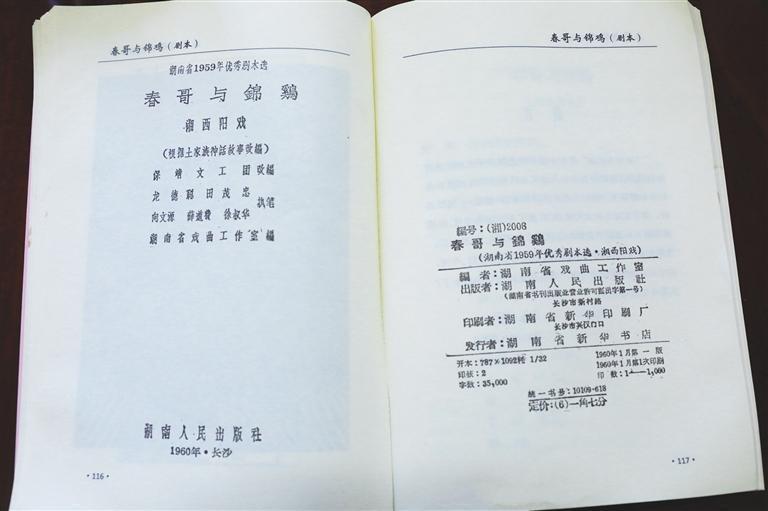 1960年1月,湖南人民出版社出版保靖文工团由《锦鸡》改编的湘西阳戏剧本《春哥与锦鸡》。