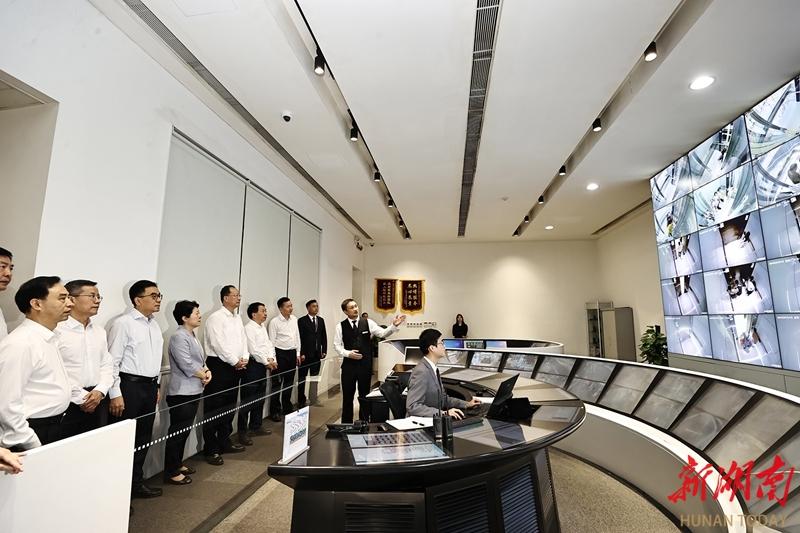 毛伟明、罗文一行在长沙市国金中心检查电梯等特种设备运行情况。