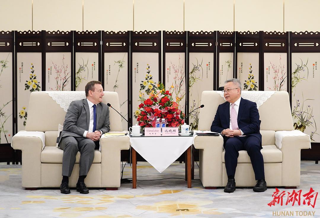 沈晓明代表省委、省政府对白玉堂一行表示欢迎,并简要介绍了湖南省情。他说,今年是中法建交60周年,习近平主席今年5月访法期间与马克龙总统达成重要共识,为开启中法关系新征程注入了强劲动力。当前,湖南正在按照党中央和习近平主席指引的方向,以“三个高地”建设为牵引,扎实推进高质量发展。湖南愿与法国各方一道,共同落实两国元首达成的重要共识,在经济贸易、科教文化、人员往来等方面深化交流合作、更好互学互鉴,为巩固和发展中法传统友谊贡献湖南力量。