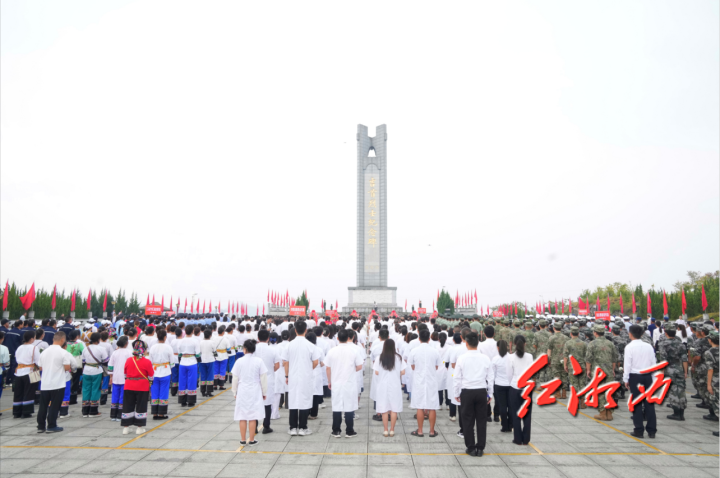 方阵前,以州委、州人大常委会、州政府、州政协、吉首军分区,吉首市委、吉首市政府,社会各界人士名义敬献的7个花篮一字排开,花篮红色缎带上的“烈士永垂不朽”金色大字熠熠生辉。