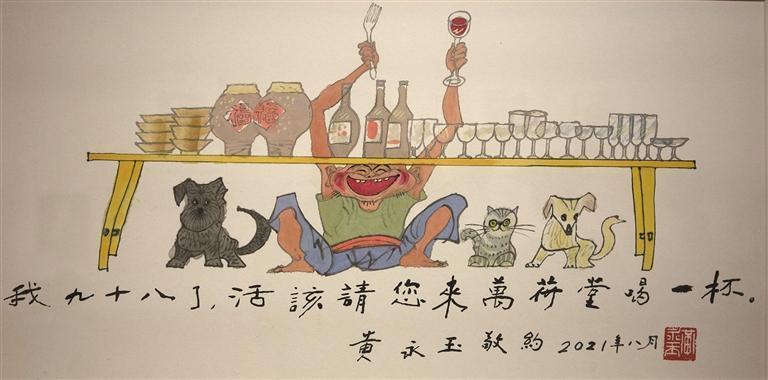 展厅里,每一幅画作皆是黄永玉艺术个性的生动展现。画作《98岁生日卡》里,老者高举斟满美酒的酒杯,开怀大笑,发出邀约——“我九十八了,活该请您来万荷堂喝一杯”;还有一幅画作,两只蓝兔拥着可爱小孩,在圆月下发出邀约——“九月十日是中秋,请来我家看月亮(管饭)”。